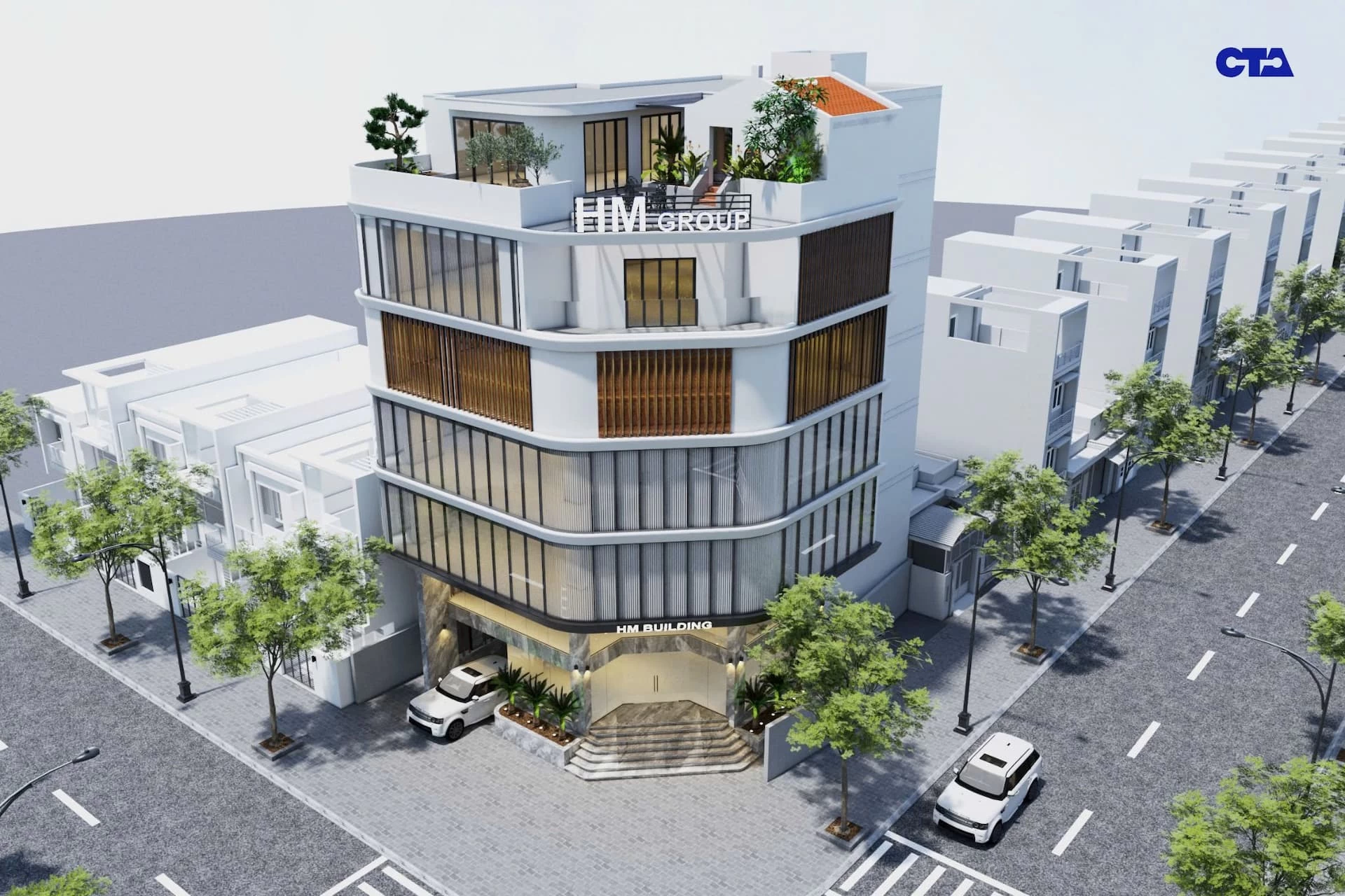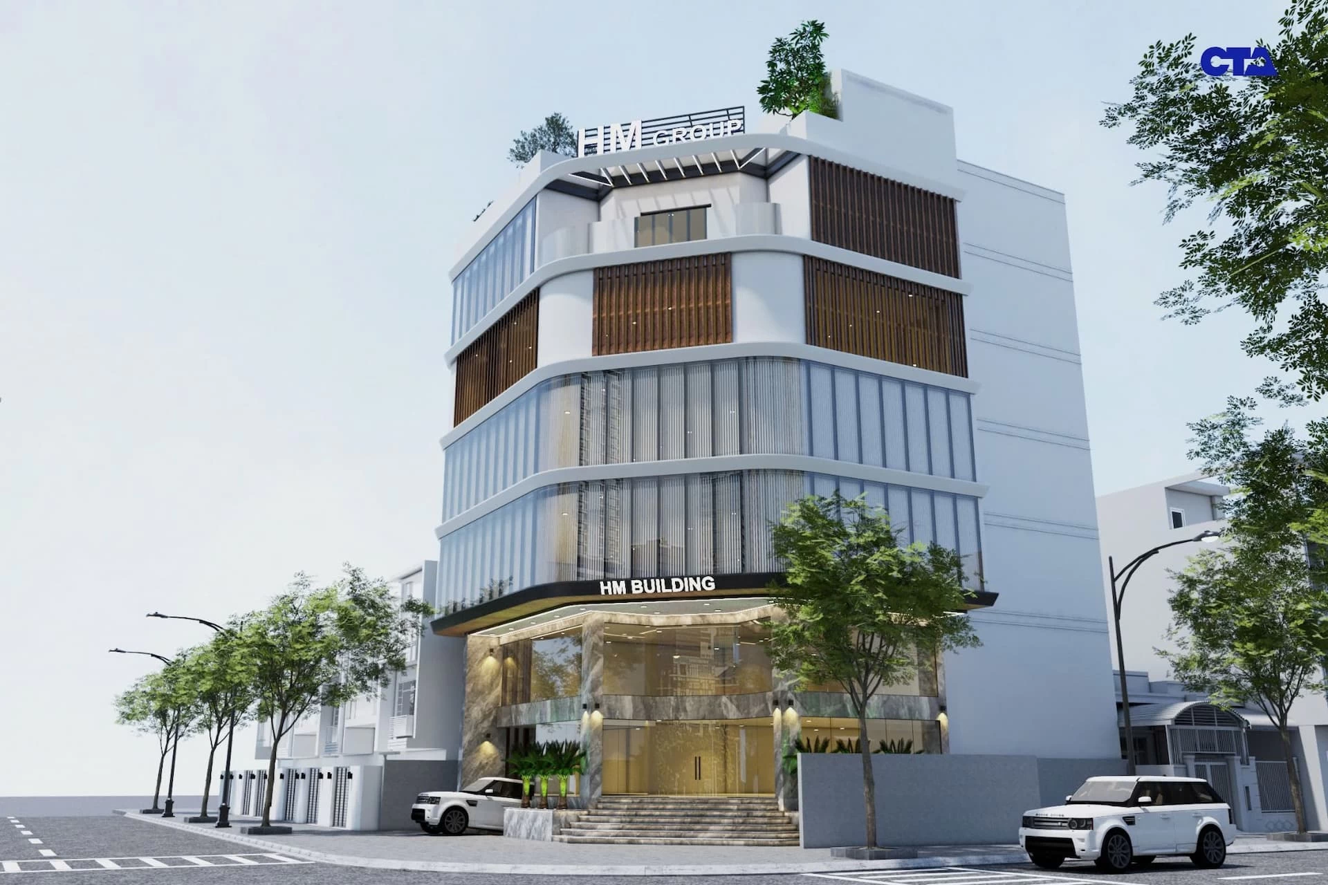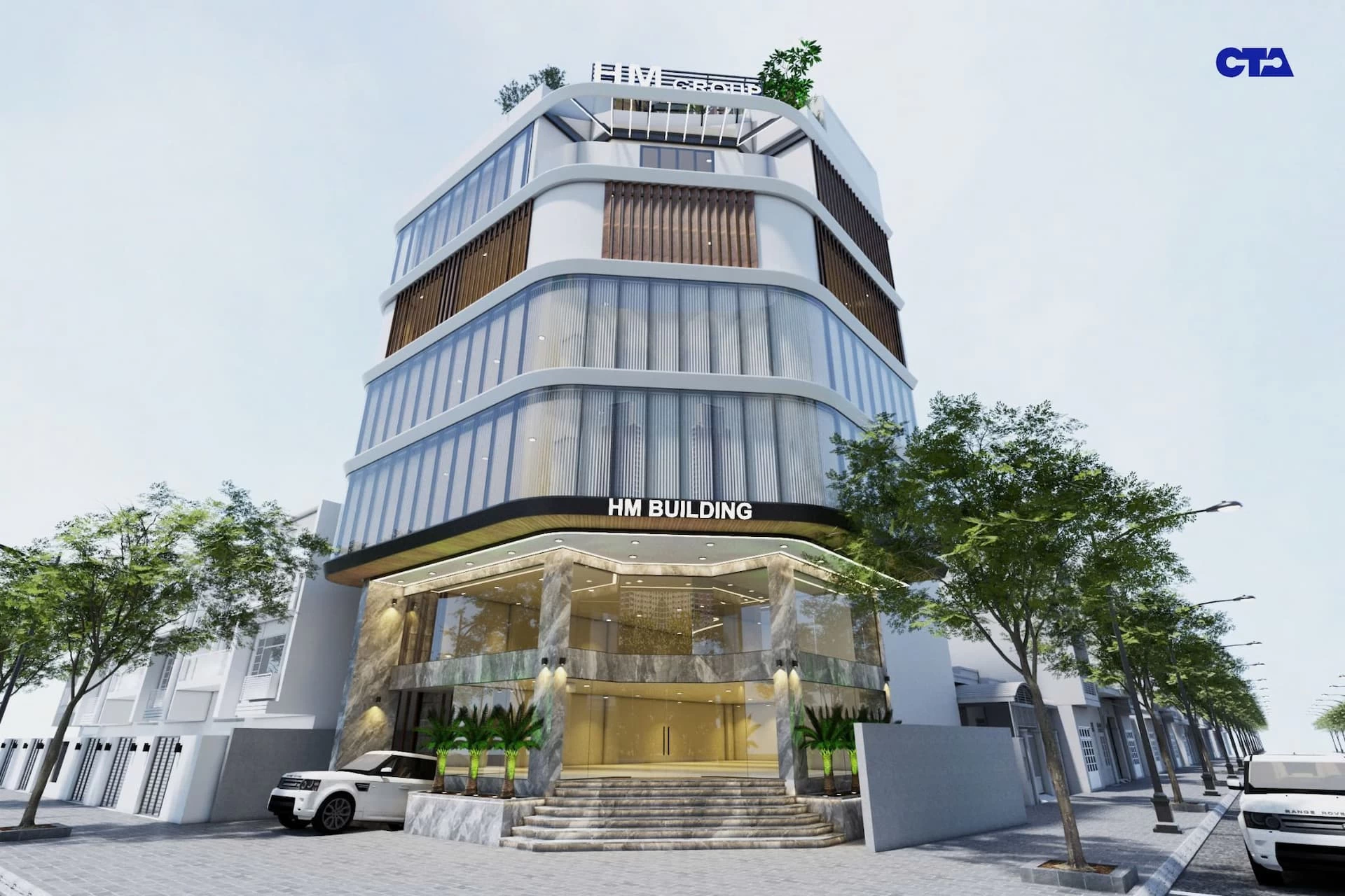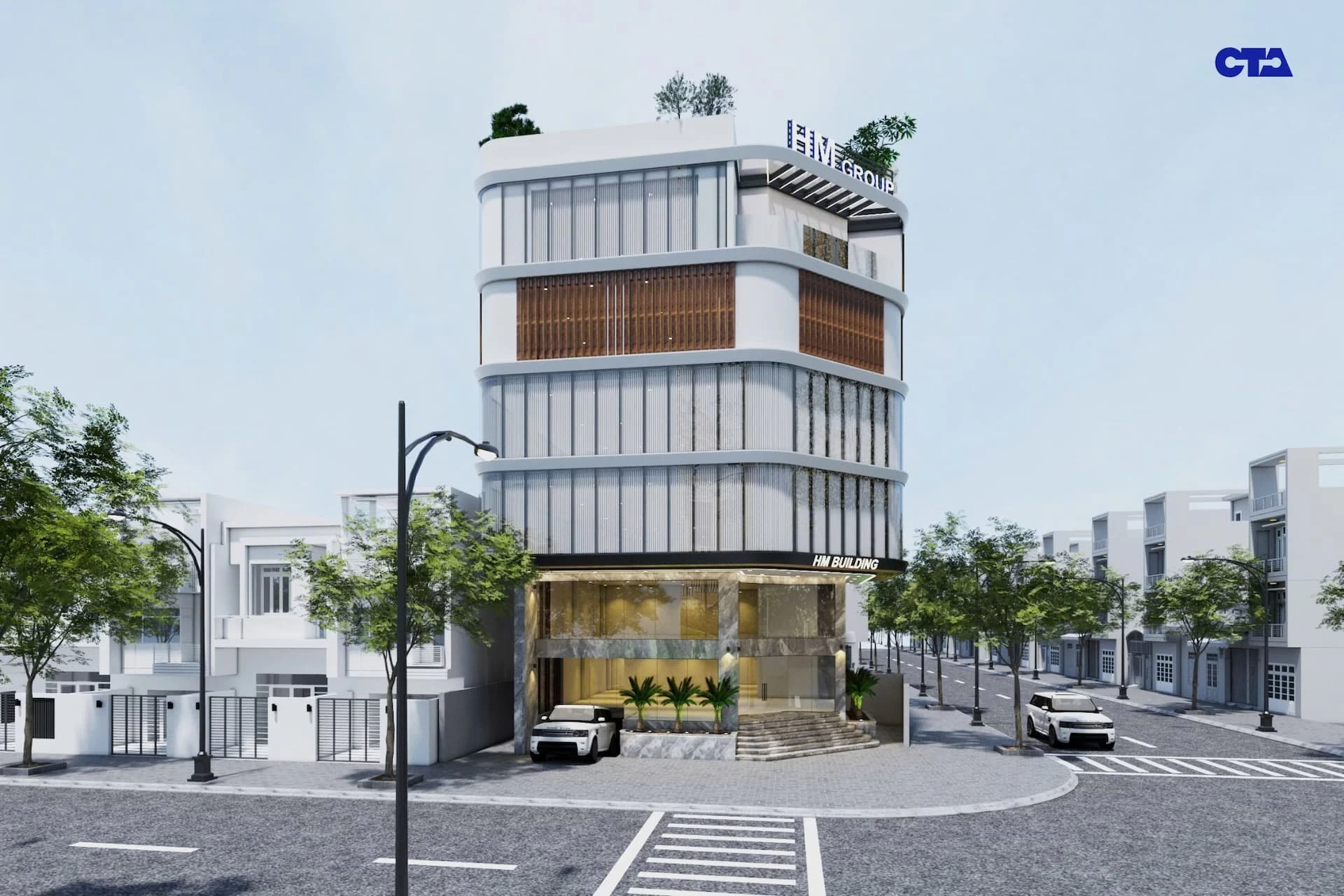 THÔNG TIN DỰ ÁN: Dự án: HM Building Diện tích khu đất: 345 m² Hạng mục thực hiện: Thiết kế cảnh quan, kiến trúc, kết cấu và MEP Địa điểm: Hoàng Mai, Hà Nội